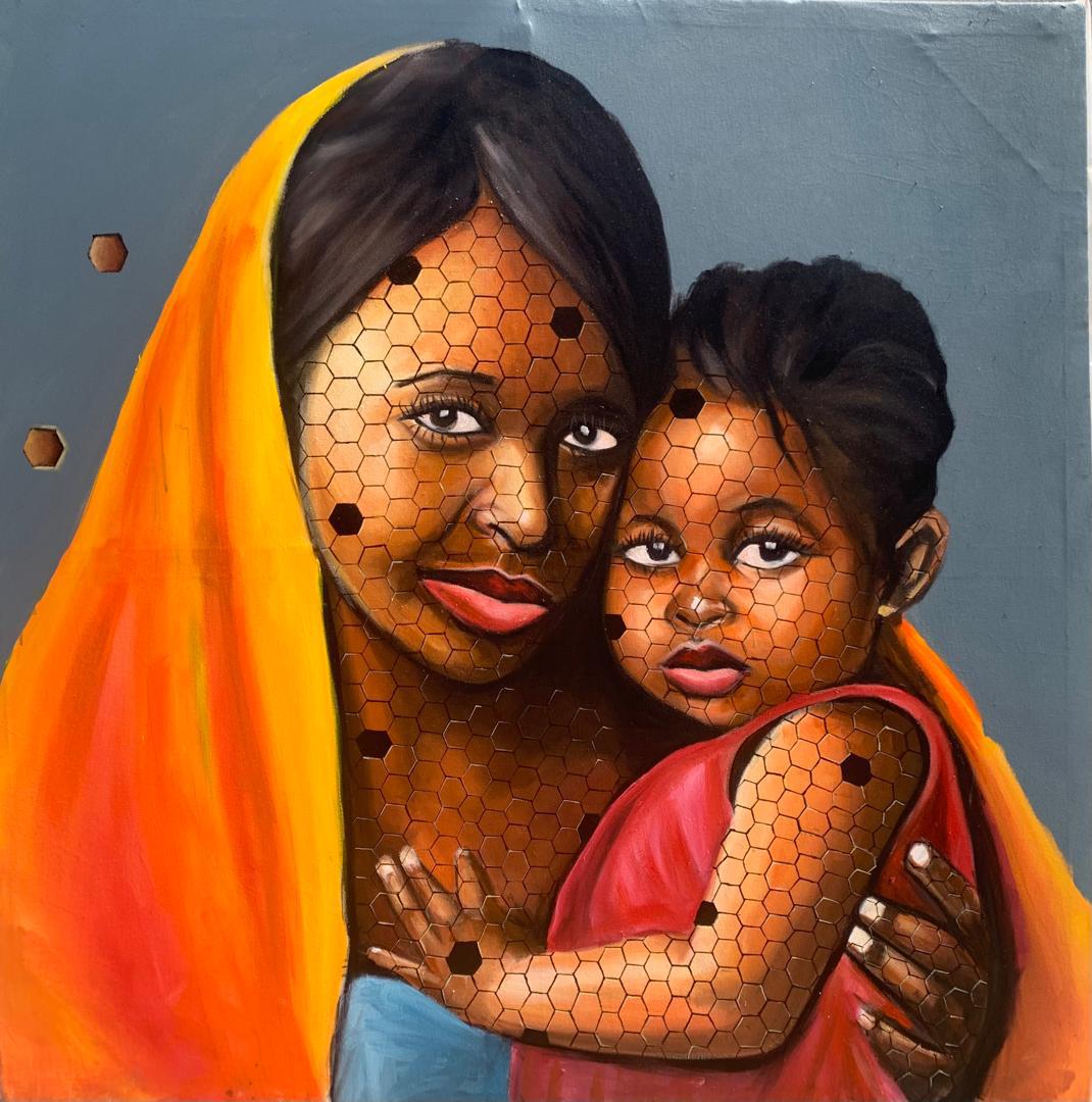 This painting captures an intimate moment of protection and affection between a mother and child. Their closeness is emphasized through overlapping forms and direct, calm gazes that meet the viewer with quiet strength. The warm hues of orange, red, and brown radiate care, resilience, and emotional depth, while the honeycomb-like pattern layered across their skin suggests interconnectedness, heritage, and shared identity. The composition speaks softly yet powerfully about nurture, lineage, and the enduring emotional ties that shape human life.