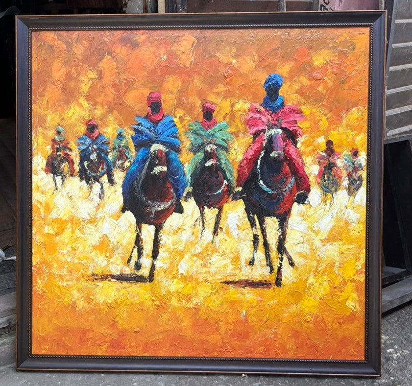Bathed in a radiant field of gold and ember, a line of riders advances with quiet power and ceremonial grace. Their flowing garments—crimson, sapphire, and jade—ignite against the glowing earth, transforming movement into rhythm and color into story. The textured strokes suggest dust rising beneath hooves, carrying echoes of tradition, leadership, and journey. Each figure stands both individual and unified, symbolizing guardianship, heritage, and the enduring march of culture across time. The painting captures not just a procession, but a moment where history, motion, and identity converge in luminous harmony.
