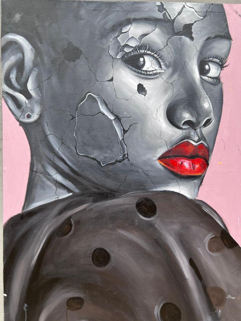 This portrait captures a moment of poised resilience. Rendered largely in grayscale, the figure appears sculptural—almost stone-like—suggesting permanence and endurance. Cracks run across the face like a fractured surface, evoking histories of pressure, transformation, and survival. Yet the subject remains composed, her gaze distant and reflective, as if looking beyond the weight she carries.