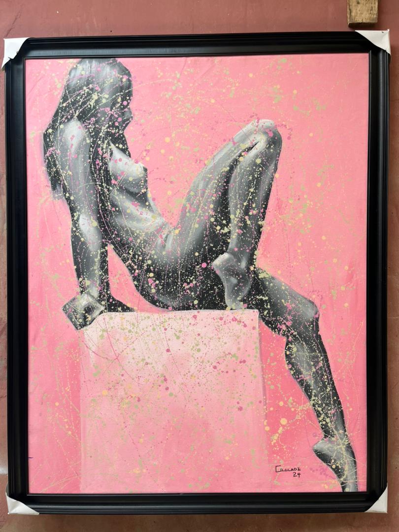 This painting captures a solitary figure suspended between stillness and motion, rendered in soft grayscale against a vivid pink ground. The relaxed yet deliberate posture suggests quiet confidence and inner balance, while the splattered and dripping paint introduces spontaneity and emotional tension. The contrast between the controlled form and the expressive surface creates a dialogue between vulnerability and strength, intimacy and exposure. The figure feels contemplative present in body, drifting in thought.