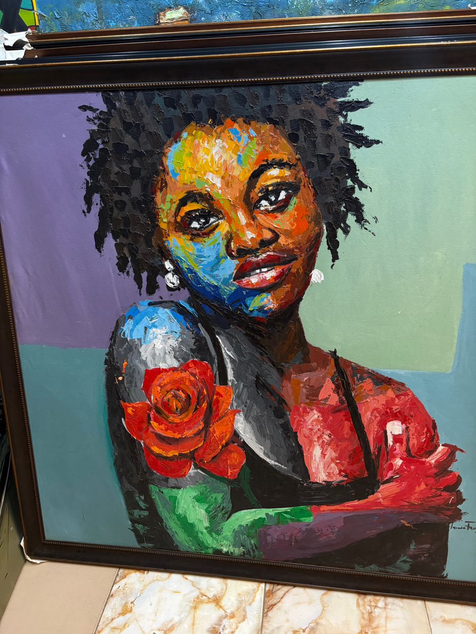 This vibrant portrait captures a woman rendered with bold, expressive strokes and rich impasto textures. The fragmented colors across her face suggest layered emotions and inner strength, while the red rose symbolizes beauty, resilience, and self-love. The confident gaze and dynamic palette celebrate individuality, femininity, and cultural pride.