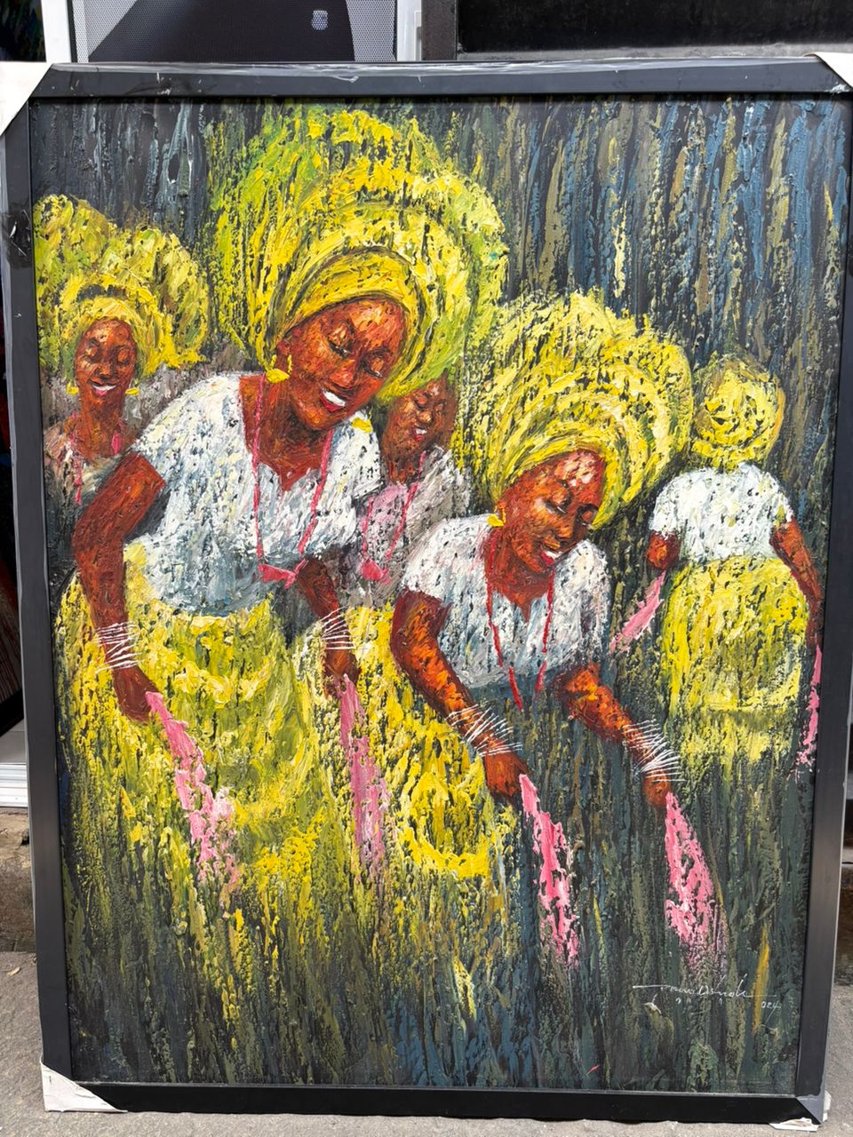 This expressive painting captures a moment of shared labor transformed into celebration. Four women, adorned in radiant yellow headwraps and flowing garments, bend gracefully as they work in harmony, their movements echoing the rhythm of a timeless dance. Thick, textured brushstrokes cascade across the canvas like rain, surrounding the figures with energy and motion, while splashes of pink and gold suggest both effort and joy. The warmth of the colors and the unity of posture convey resilience, sisterhood, and the beauty found in collective strength. It is a tribute to tradition, dignity, and the quiet poetry of women shaping life with their hands.