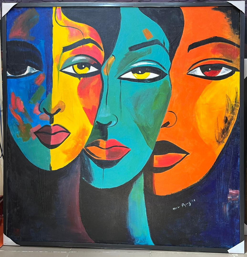This painting presents identity as layered, fluid, and collective. Three faces merge into a single composition, each rendered in bold, contrasting fields of color; blue, yellow, green, and orange, suggesting different emotional states, histories, or selves coexisting at once. Though divided by color and form, the faces share a common gaze and structure, reinforcing unity within difference.