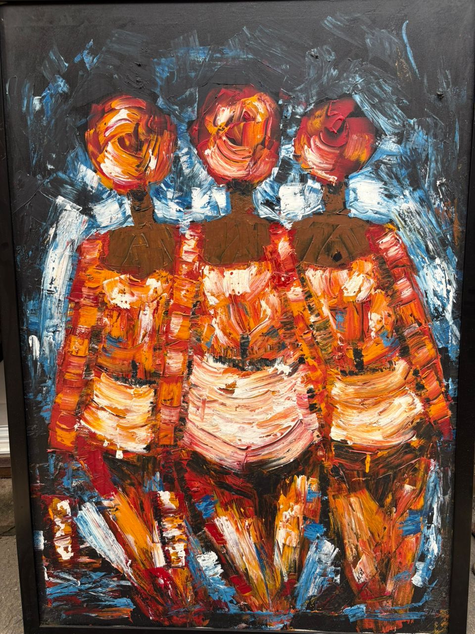 This painting portrays three stylized female figures standing closely together, their forms built with bold, expressive brushstrokes and rich earthy tones of red, orange, and brown. The absence of detailed facial features shifts focus from individual identity to collective presence. The textured layers and dynamic strokes convey strength, resilience, and unity, while the contrasting cool blues in the background heighten the emotional intensity and balance the warmth of the figures. The composition celebrates shared experience, sisterhood, and cultural pride.