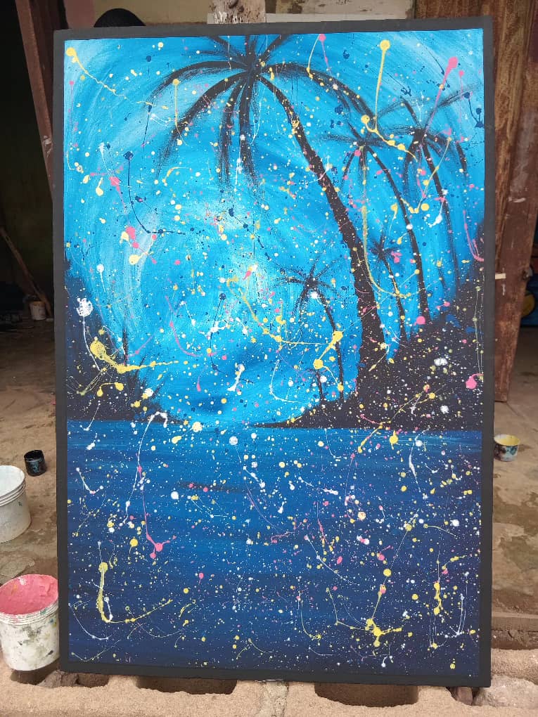 This high-impact, semi-abstract painting is a vivid celebration of rhythmic labor and the deconstruction of the musician. It utilizes the artist's signature cubist lens to harmonize the performer's form with a complex, vibrating landscape of cultural motifs and kinetic energy.