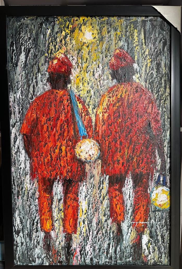 Two figures move forward side by side beneath a curtain of falling rain, their backs turned to the viewer as they step into a glowing night. Dressed in warm shades of red and orange, they become twin silhouettes of companionship and quiet resolve. Between them hangs a small lantern, its soft golden light cutting gently through the heavy texture of rain and shadow, guiding their shared path.