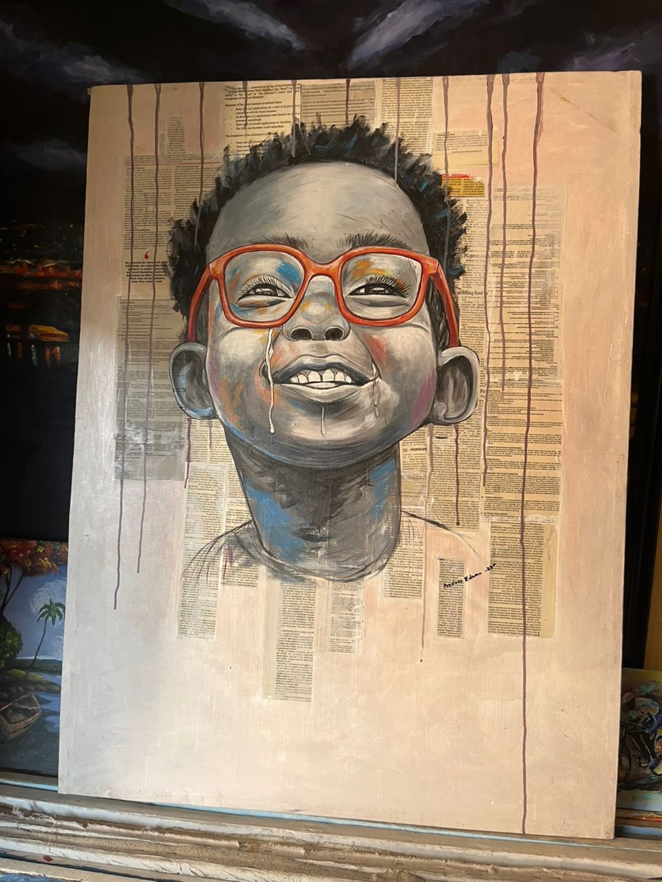 This striking portrait captures the delicate contrast between joy and hidden sorrow. The child’s radiant smile, framed by bold red glasses, glows with innocence and warmth, yet faint tears trace silent paths down the cheeks, revealing an unspoken story beneath the surface. Set against a textured background of layered newspaper print, the painting suggests how personal emotions are shaped and sometimes overshadowed by the noise of the world. The artist’s use of soft grays, gentle blues, and warm highlights creates a tender balance between vulnerability and resilience. It is a powerful meditation on childhood strength, reminding us that even the brightest smiles can carry deep and beautiful truths.