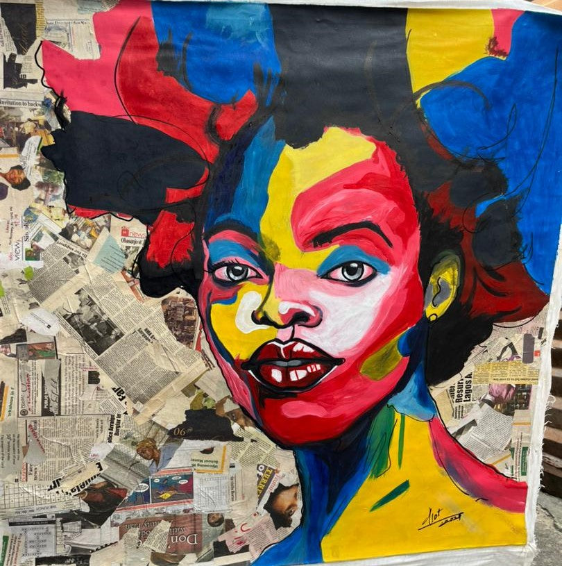 This painting presents identity as bold, layered, and unapologetically expressive. The figure’s face is fractured into striking planes of red, blue, yellow, and black, transforming portraiture into a visual declaration of presence. The intense gaze confronts the viewer directly, suggesting confidence, defiance, and self-awareness.